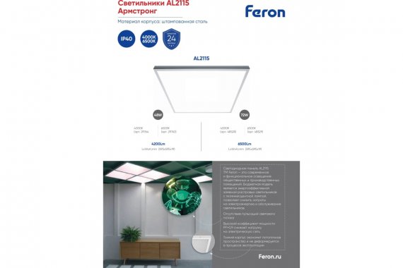 Светодиодная панель FERON встраиваемая в Армстронг AL2115 48W, 4200Lm, 4000K, призма 29764 предназначен для освещения помещений различного назначения.