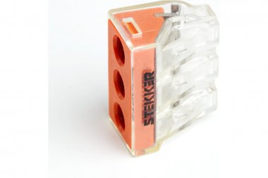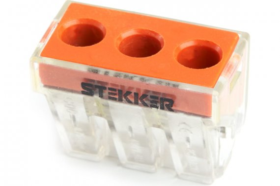 Клемма пружинная компактная STEKKER LD773-173, 3-проводная 2,5 - 6 мм2, 450В, 41А, без пасты, материал изделия поликарбонат, латунь, сталь. Тип провода одножильный, материал провода медь, температура окружающей среды - 25...+40°С