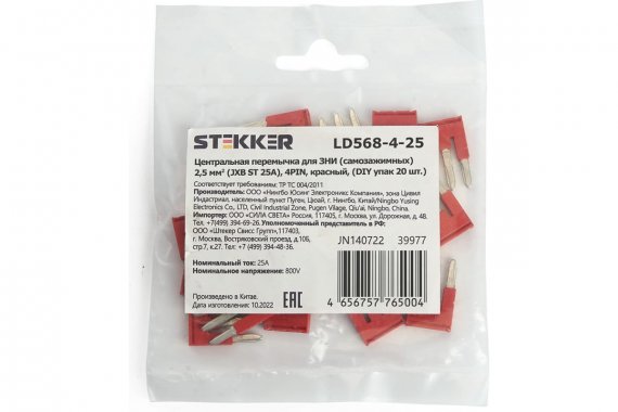 LD568-4-25 Центральная перемычка для ЗНИ самозажимных 2,5 мм² (JXB ST 2,5) 4PIN (DIY упак 20 шт) Токоведущая часть перемычек – латунь, 4 контакта, соответствуют размерному ряду клемм ЗНИ самозажимных 2,5 мм² (JXB ST 2,5) Для соединения ЗНИ по центру. Применение: шкафы, щиты, сборки, в качестве комплектации для технологического оборудования. Наличие центральных перемычек позволяет создавать блоки распределения без дополнительных усилий.