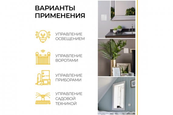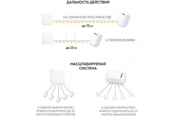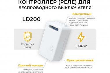 LD200 Контроллер для управления осветительным оборудованием на 1 канал, радиочастотный, с напряжением 230V мощностью для ЛОН 1200Вт и 500Вт для LED, максимальный ток 10А, цвет белый, IP20. Контроллер подключается к сети 230V и устройству, которым вы хотите управлять, например, к люстре. Для передачи сигнала используется радиоканал 433 МГц, что позволяет размещать выключатели (TM81, TM82, TM83) в любом удобном месте и перемещать их по мере необходимости. Все, что необходимо сделать – это установить контроллер в разрыв фазы, «привязать» нужную клавишу к контроллеру и установить или использовать как пульт. Допустимое расстояние между контроллером и пультом до 70м. без перекрытий и до 25 м. с перекрытиями. Преимущество беспроводной системы заключается в том, что выключатель системы работает без батареек на основе пьезоэлемента. Устройства можно объединить в одну систему.