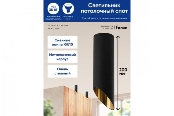 Светильник накладной под лампу, спот (ИПО) FERON ML182, GU10 35W, 230V, IP20, цвет черный, корпус металл, 55*55*200