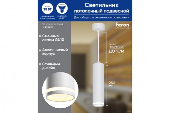 Светильник накладной под лампу, спот (ИПО) FERON ML1708, GU10 35W, 230V, IP20, цвет белый, корпус алюминий, акрил, 55*55*280