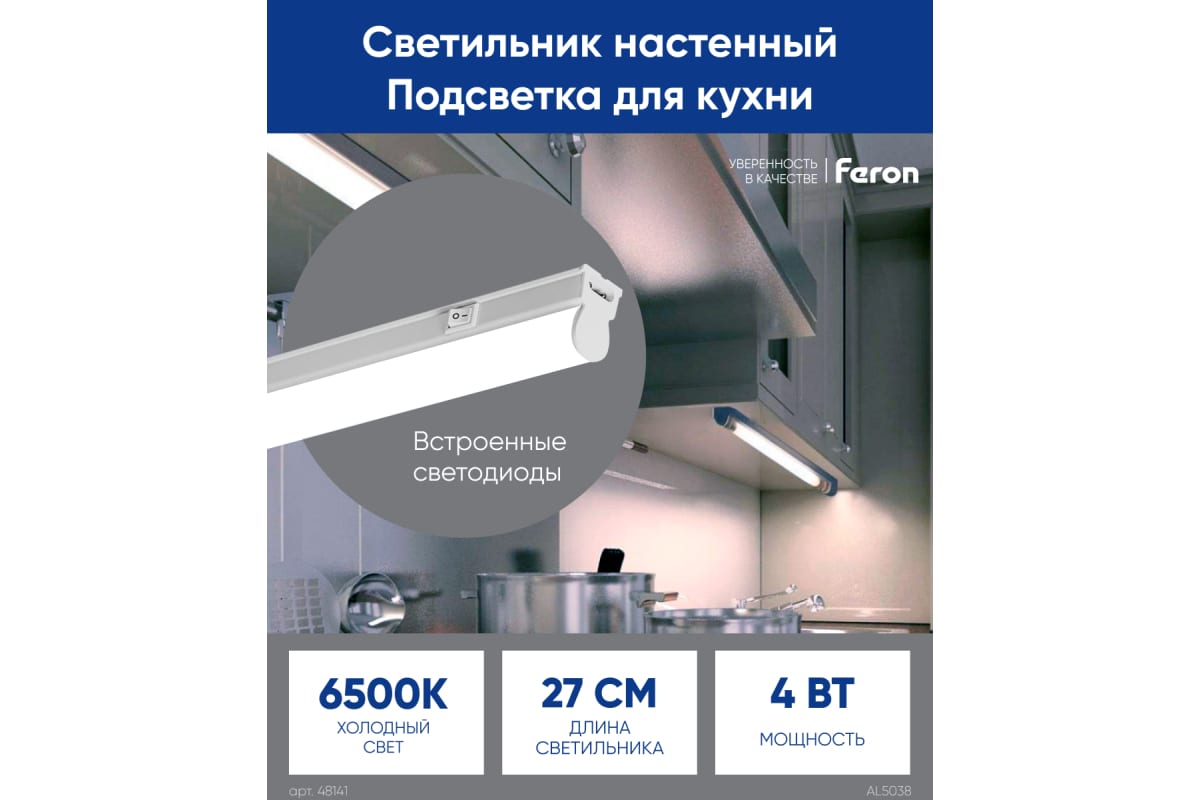 Светильник линейный светодиодный, с возможностью соединения в линию (ДПО) FERON AL5038, 4W, 6500К (дневной), 165-275V, 350Lm, IP20, цвет белый, корпус пластик, рассеиватель пластик PC, 270*22*35 мм