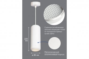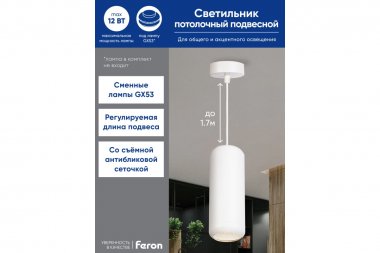 Технические характеристики FERON hl3658 barrel echo levitation 12w, 230v, gx53, белый, с антибликовой сеточкой, на подвесе 1,7 м, 48402