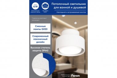 Накладные светильники FERON является отличным решением для ванных и душевых комнат, тк имеет степень защиты IP44. Компактный размер и лаконичный дизайн светильников позволяют органично вписать их в любой интерьер, сделав акцент на самом важном. Также уникален в способе установки: накладной или встраиваемый. Принять решение можно уже после покупки, ведь все необходимое для двух вариантов монтажа идет в комплекте