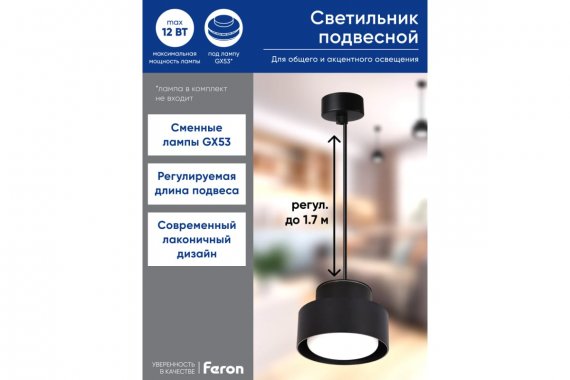Технические характеристики FERON hl3678 barrel aura levitation 12w, 230v, gx53, чёрный, на подвесе 1,7 м, 48409