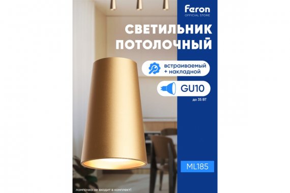 Светильник накладной под лампу, спот (ИПО) FERON ML185, GU10 35W, 230V, IP20, цвет золото, корпус алюминий, 70*70*110