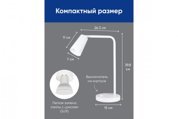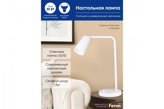 Светильник настольный, FERON DE185, белый, 35W, 230V, GU10 материал металл, в комплекте без лампы, сетевой шнур - 1,5м, 263*150*398мм