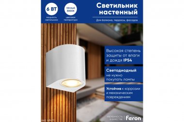 Светильник уличный светодиодный, на стену (ДБУ) FERON DH052, серия Бостон, 6W, 3000К (теплый белый), 230V/50Гц, 400Lm, IP54, 1LED*COB, класс защиты 1, раб.t -40°C...+40°C, цвет белый, корпус алюминий, 55*55*65мм,