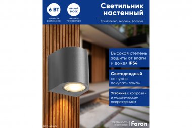 Светильник уличный светодиодный, на стену (ДБУ) FERON DH052, серия Бостон, 6W, 3000К (белый натуральный), 230V/50Гц, 400Lm, IP54, 1LED*COB, класс защиты 1, раб.t -40°C...+40°C, цвет серый, корпус алюминий, 55*55*65мм,