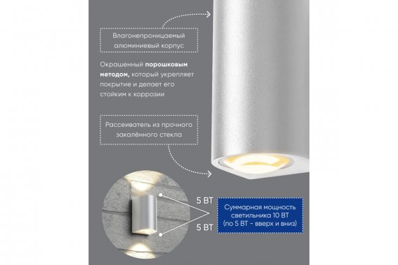 Светильник уличный светодиодный, на стену (ДБУ) FERON DH053, серия Бостон, 2*5W, 3000К (теплый белый), 230V/50Гц, 800Lm, IP54, 2LED*COB, класс защиты 1, раб.t -40°C...+40°C, цвет белый, корпус алюминий, 55*55*100мм,