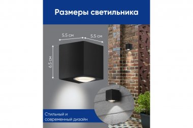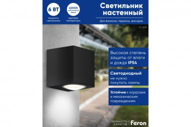 Светильник уличный светодиодный, на стену (ДБУ) FERON DH054, серия Бостон, 6W, 4000К (белый натуральный), 230V/50Гц, 400Lm, IP54, 1LED*COB, класс защиты 1, раб.t -40°C...+40°C, цвет черный, корпус алюминий, 55*55*65мм,