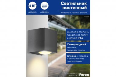 Светильник уличный светодиодный, на стену (ДБУ) FERON DH054, серия Бостон, 6W, 3000К (теплый белый), 230V/50Гц, 400Lm, IP54, 1LED*COB, класс защиты 1, раб.t -40°C...+40°C, цвет серый, корпус алюминий, 55*55*65мм,