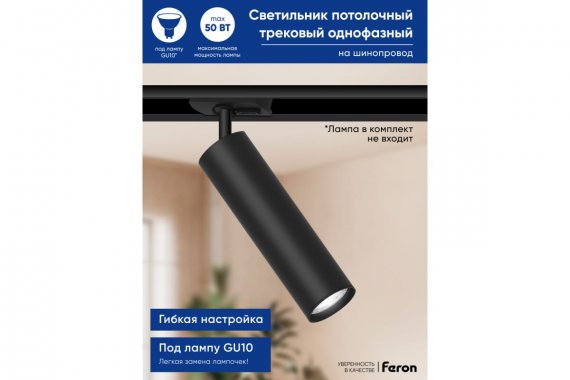 Светильники трековые на шинопровод GU10, однофазный (ИВО) FERON AL194, 15W, 230V, цвет черный, корпус алюминий, вращение ?350°/?90°, 56*56*200 мм