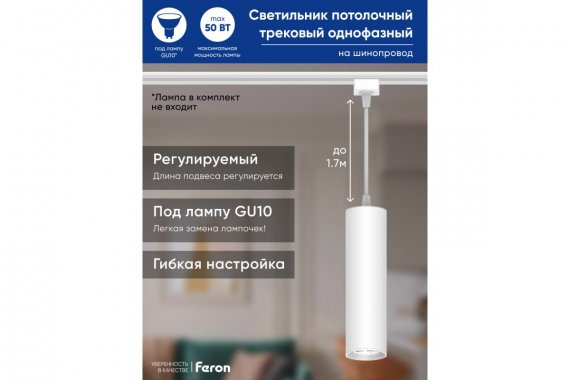 Feron 48556 Светильники трековые на шинопровод GU10, однофазный (ИВО) AL196, 15W, 230V