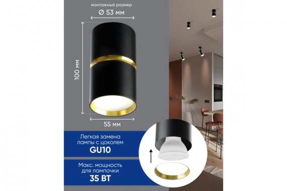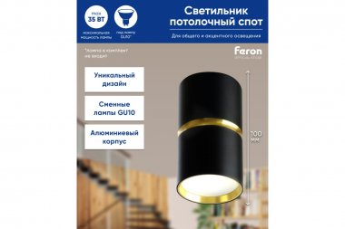 Светильник накладной под лампу, спот (-) FERON ML186, GU10 35W, 230V, IP20, цвет черный-золото , корпус алюминий, 55*55*100