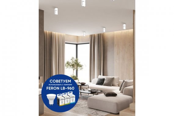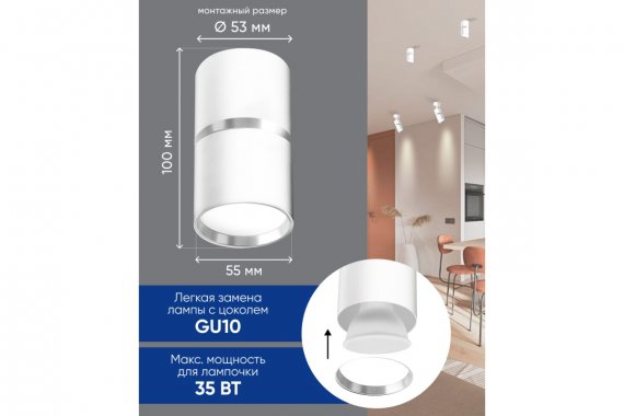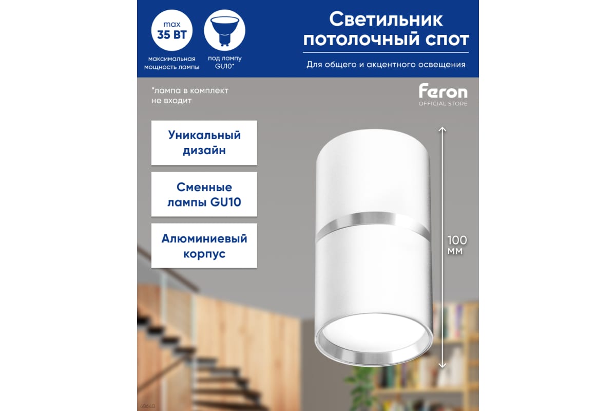 Светильник накладной под лампу, спот (-) FERON ML186, GU10 35W, 230V, IP20, цвет белый-хром, корпус алюминий, 55*55*100