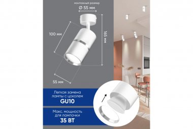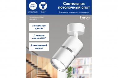 Светильник накладной под лампу, спот (-) FERON ML1861, GU10 35W, 230V, IP20, цвет белый-хром, корпус алюминий, 55*55*165
