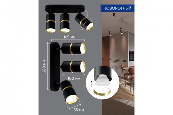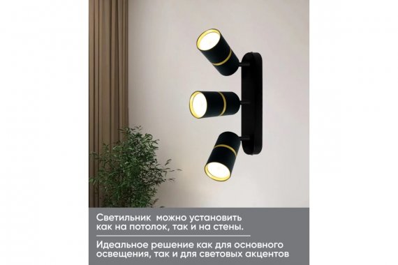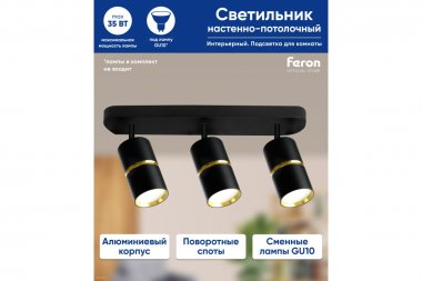 Светильник накладной под лампу, спот (-) FERON ML1863 , GU10 3*35W, 230V, IP20, цвет черный-золото , корпус алюминий, 380*55*165