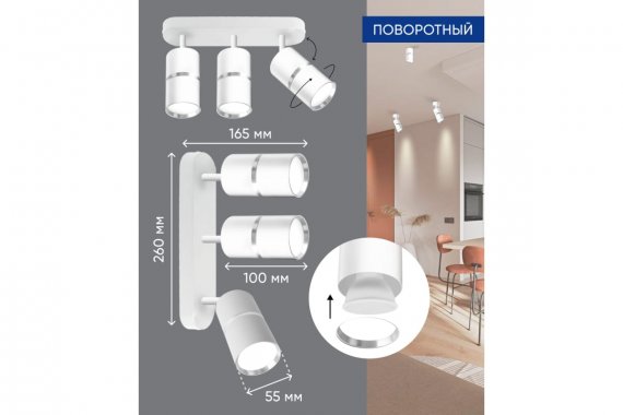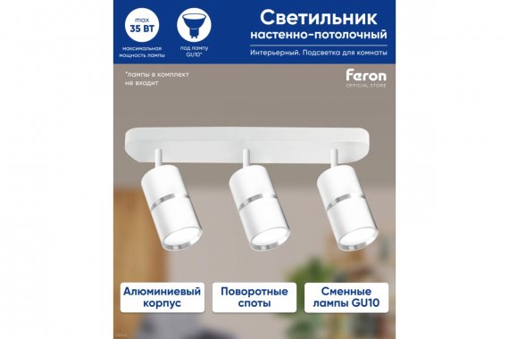 Светильник накладной под лампу, спот (-) FERON ML1863, GU10 3*35W, 230V, IP20, цвет белый-хром, корпус алюминий, 380*55*165