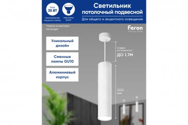 Технические характеристики FERON ml1878 на подвесе, mr16, 35w, 230v, белый 55x200 48656