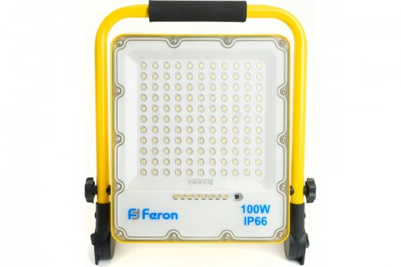 Прожектор светодиодный переносной с ручкой, с зарядным устройством (ДО) FERON LL-952, 100W, 6400К (холодный белый), AC180-240V/50Гц, 1500Lm, IP66, угол рассеивания 120°,*SMD5730, раб.t -40°C - +40°C, цвет жёлтый, корпус алюминий, 60*290*350 мм