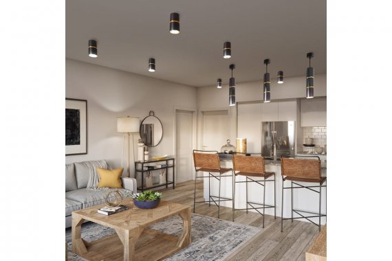 Это лучший вариант для создания акцентного освещения внутри помещения, они позволяют регулировать направление угла светового потока и расставить акценты на определённых деталях интерьера. Благодаря тому, что светильники можно легко перемещать по однофазному шинопроводу, трековая система получается мобильной и её можно установить на любой высоте (с помощью аксессуара CAB1002). Цветовая температура свечения и мощность зависит от установленной лампы.