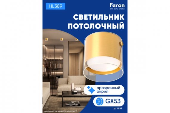 Светильник накладной под лампу, спот (-) FERON HL389, GX53 12W, 230V, IP20, цвет золото, корпус алюминий, акрил, 80*80*85