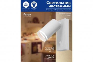 Подсветка настенная MR16 (накладной) FERON ML1620 белый, 35W, 230V, корпус алюминий, акрил, IP20, 55*90*140мм,