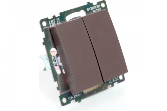Выключатель двухклавишный STEKKER GLS10-7104-04, серия Катрин тип установки - скрытый, размер изделия 55*55*35мм., цвет шоколад, материал изделия поликарбонат, латунь. Номинальное напряжение 250 , номинальный ток 10А, IP20