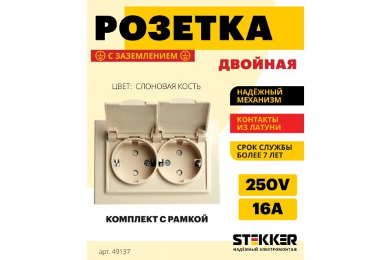 Розетка STEKKER PST16-9015-02 на 2 гнездо, с крышкой, с заземлением. Материал: PP пластик/ABS пластик, латунь, цвет слоновая кость, размер 117*84*45мм. Номинальное напряжение 250, номинальный ток 16А, диапазон рабочих температур 0..+35°C, IP20