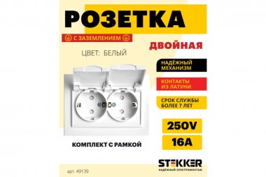 Розетка STEKKER PST16-9015-01 на 2 гнездо, с крышкой, с заземлением. Материал: PP пластик/ABS пластик, латунь, цвет белый, размер 117*84*45мм. Номинальное напряжение 250, номинальный ток 16А, диапазон рабочих температур 0..+35°C, IP20