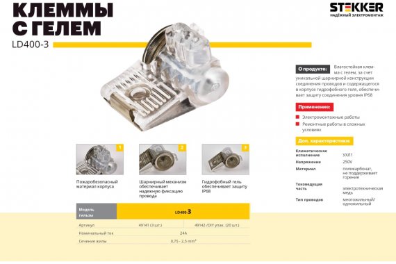 Технические характеристики STEKKER ld400-3 ip68 с гелем 49141