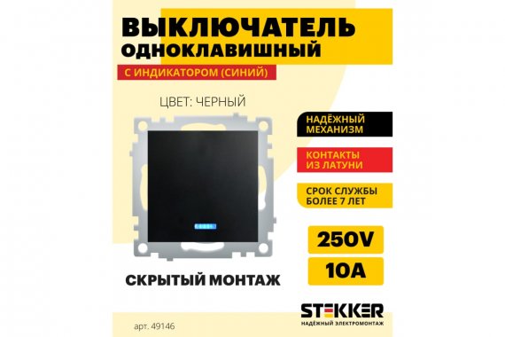 Выключатель одноклавишный STEKKER PSW10-9101-03, серия Эрна, с подсветкой (синий), тип установки - скрытый, размер изделия 55*55*35мм., цвет черный, материал изделия PP пластик/ABS пластик, латунь. Номинальное напряжение 250 , номинальный ток 10А, IP20