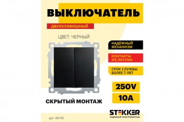Выключатель двухклавишный STEKKER PSW10-9104-03, серия Эрна тип установки - скрытый, размер изделия 55*55*35мм., цвет черный, материал изделия PP пластик/ABS пластик, латунь. Номинальное напряжение 250 , номинальный ток 10А, IP20