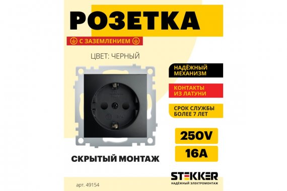 Розетка STEKKER PST16-9110-03 на 1 гнездо, с заземлением. Материал: PP пластик/ABS пластик, латунь, цвет черный, размер 55*55*35мм. Номинальное напряжение 250, номинальный ток 16А, диапазон рабочих температур 0..+35°C, IP20