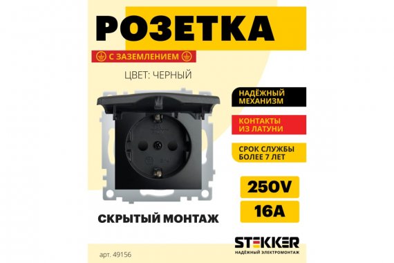 Розетка STEKKER PST16-9112-03 на 1 гнездо, с крышкой, с заземлением. Материал: PP пластик/ABS пластик, латунь, цвет черный, размер 55*55*45мм. Номинальное напряжение 250, номинальный ток 16А, диапазон рабочих температур 0..+35°C, IP20