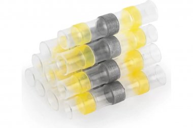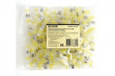 Термоусадочные коннекторы STEKKER LD302-40-60, длина 40мм. 100шт. в наборе, цвет: прозрачный,желтый. Коэффициент усадки 2:1, диапазон рабочих температур -10..+35°C, температура усадки +85..+125°C, номинальный ток 48А, для проводов сечением мм2.