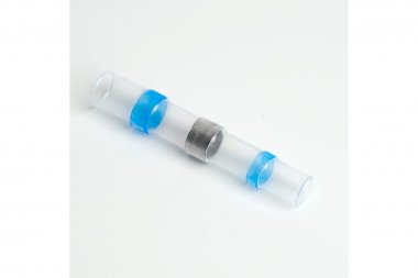 Термоусаживаемые гильзы с припоем используются для соединения проводов. Соединение происходит при нагревании оловянного припоя в центре трубки строительным феном, кроме этого, сама прозрачная трубка усаживается при нагревании, а цветные кольца с термоклеем дополнительно фиксируют провод внутри трубки.