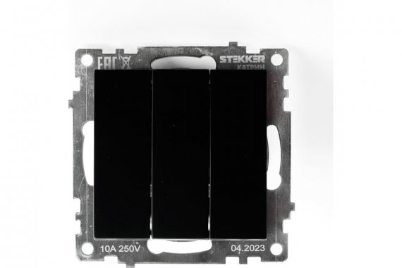 Выключатель трехклавишный STEKKER GLS10-7108-05, серия Катрин тип установки - скрытый, размер изделия 55*55*35мм., цвет черный, материал изделия поликарбонат, латунь. Номинальное напряжение 250 , номинальный ток 10А, IP20