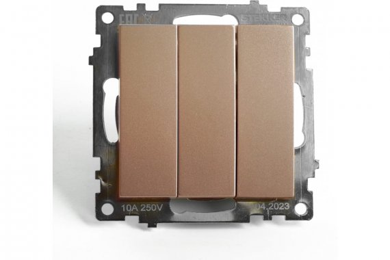 Выключатель трехклавишный STEKKER GLS10-7108-02, серия Катрин тип установки - скрытый, размер изделия 55*55*35мм., цвет шампань, материал изделия поликарбонат, латунь. Номинальное напряжение 250 , номинальный ток 10А, IP20