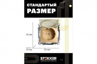 Розетка STEKKER GLS16-7112-08 на 1 гнездо, с крышкой, с заземлением. Материал: поликарбонат, латунь, цвет золото, размер 55*55*35мм. Номинальное напряжение 250, номинальный ток 16А, диапазон рабочих температур 0..+35°C, IP20