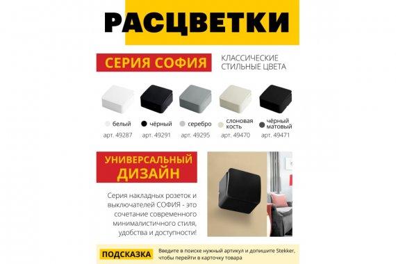 Серия София Stekker открытой установки выполнена в современном дизайне. Серия София имеет большой ассортимент изделий, который позволяет использовать их в самых различных проектах. Широкий выбор из 5 цветов позволит подобрать цветовые сочетание для любого интерьера. Не горючий внутренний блок и устойчивый к УФ излучению материал исполнения обеспечат безопасность и долговечность использования.