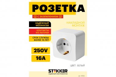 Розетка STEKKER MST16-11-01 на 1 гнездо, с заземлением. Материал: ABS пластик, цвет белый, размер 60*60*40мм. Номинальное напряжение 230, номинальный ток 16А, диапазон рабочих температур 0..+35°C, IP20