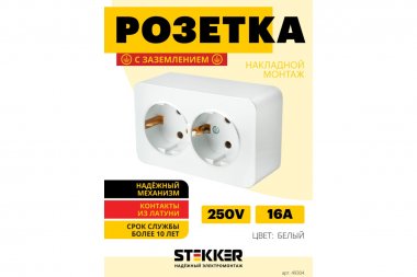Розетка STEKKER MST16-12-01 на 2 гнездо, с заземлением. Материал: ABS пластик, цвет белый, размер 124*60*40мм. Номинальное напряжение 230, номинальный ток 16А, диапазон рабочих температур 0..+35°C, IP20