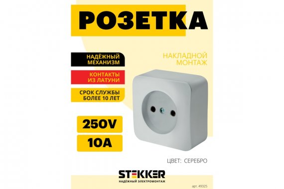 Розетка STEKKER MST10-11-03 на 1 гнездо, без заземления. Материал: ABS пластик, цвет серебро, размер 60*60*30мм. Номинальное напряжение 230, номинальный ток 10А, диапазон рабочих температур 0..+35°C, IP20