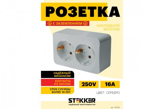 Розетка STEKKER MST16-12-03 на 2 гнездо, с заземлением. Материал: ABS пластик, цвет серебро, размер 124*60*40мм. Номинальное напряжение 230, номинальный ток 16А, диапазон рабочих температур 0..+35°C, IP20
