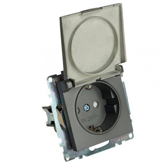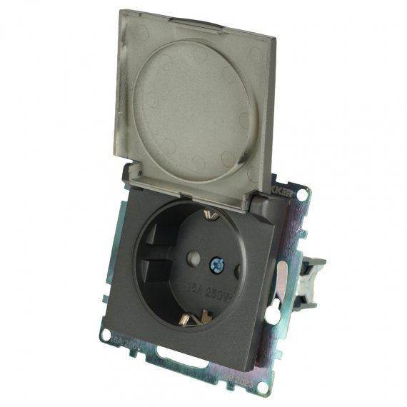 Розетка STEKKER GLS16-7112-06 (IP44 при закрытой крышке) на 1 гнездо, с крышкой, с заземлением. Материал: поликарбонат, латунь, цвет графит, размер 73*73*50мм. Номинальное напряжение 250, номинальный ток 16А, диапазон рабочих температур 0..+35°C, IP20