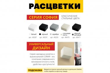 Серия накладных электроустановочных изделий София отличается современным дизайном, широкой цветовой линейкой и высоким качеством изделий. Она станет стильным элементом дизайна, как в классическом, так и современном интерьере.