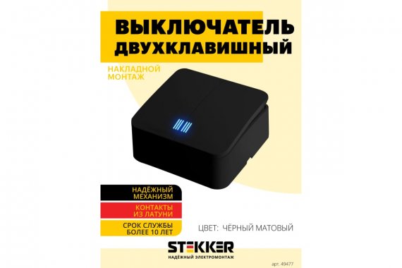 Выключатели двухклавишный STEKKER MSW10-21-05, серия София, с подсветкой (синий), тип установки - открытый, размер изделия 65*65*35мм., цвет черный матовый, материал изделия ABS пластик. Номинальное напряжение 250 , номинальный ток 10А, IP20